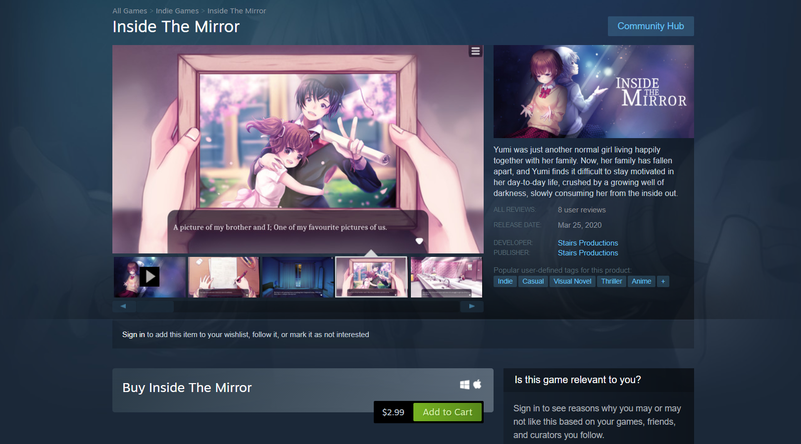 Our flagship game Inside The Mirror was our attempt to reach out to those suffering from mental illness, as well as their friends and family, and break down the walls built by stigma. Everyone on the team had experience with mental illness in one way or another, which made this project very personal. This of course had its good, bad, and ugly sides which I’ll go through below.